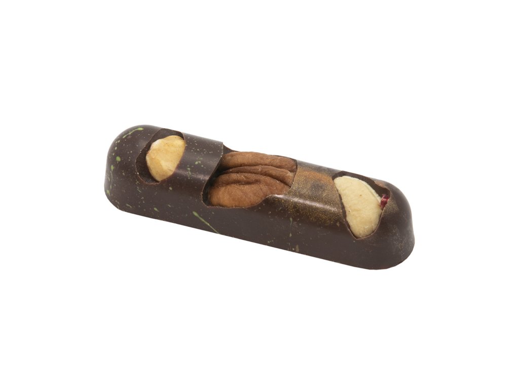 Hořká čokoláda 70% (cukr, kakaové máslo, kakaová hmota, emulgátor E322 (sojový lecitin), přírodní vanilkové aroma), barevné kakaové máslo (může obsahovat látky, které mohou nepříznivě ovlivnit činnost a pozornost u dětí). Obsah alergenů: 6 (sója), 7 (mléko), 8 (skořápkové plody - lískové ořechy, kešu ořechy, pekany) Složení a Alergeny ▸