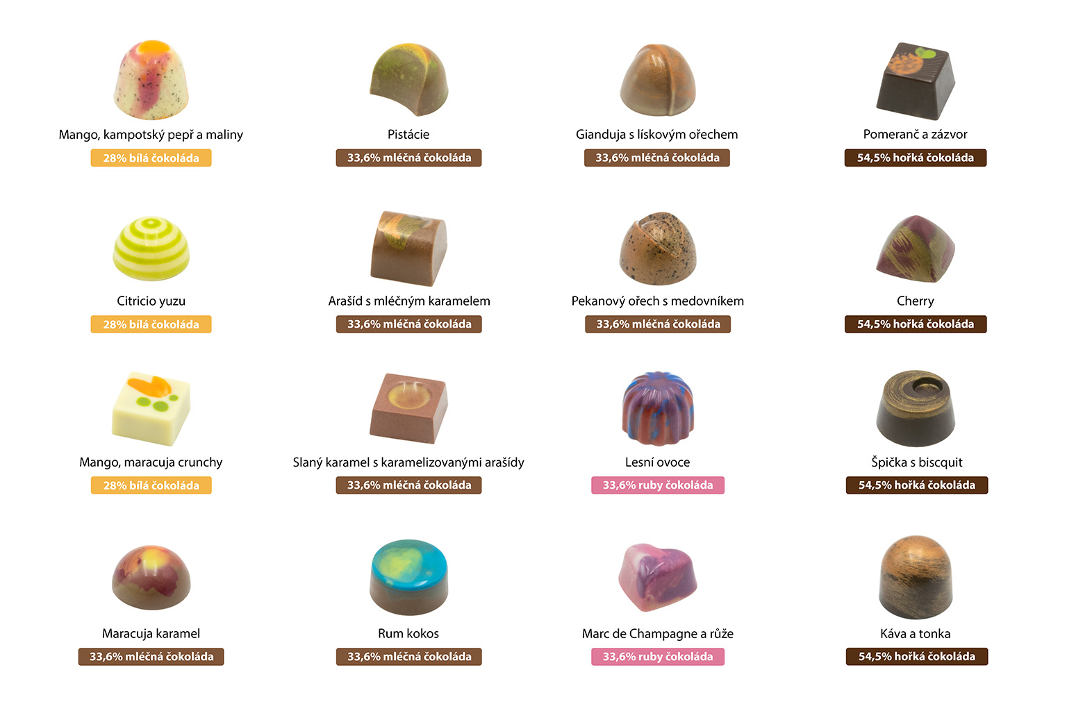 Mango, kampotský pepř a maliny - Bílá čokoláda 28% (cukr, kakaové máslo, sušené plnotučné mléko, emulgátor E322 (sojový lecitin), přírodní vanilkové aroma), mangové pyré, smetana 33%, kampotský pepř černý, sušené maliny, konfitura z manga a maracuji, barevné kakaové máslo. Obsah alergenů: 6 (sója), 7 (mléko) Citrico yuzu - Bílá čokoláda 28% (cukr, kakaové máslo, sušené plnotučné mléko, emulgátor E322 (sojový lecitin), přírodní vanilkové aroma), limetová šťáva, yuzu pasta, smetana 33%, barevné kakaové máslo. Obsah alergenů: 6 (sója), 7 (mléko) Mango, maracuja crunchy - Mléčná čokoláda 33,6% (cukr, kakaové máslo, sušené plnotučné mléko, kakaová hmota, emulgátor E322 (sojový lecitin), přírodní vanilkové aroma), Bílá čokoláda 28% (cukr, kakaové máslo, sušené plnotučné mléko, emulgátor E322 (sojový lecitin), přírodní vanilkové aroma), pyré ze sušené maracuji a manga, kousky sušenek, barevné kakaové máslo. Obsah alergenů: 1 (pšenice), 6 (sója), 7 (mléko) Maracuja karamel - Mléčná čokoláda 33,6% (cukr, kakaové máslo, sušené plnotučné mléko, kakaová hmota, emulgátor E322 (sojový lecitin), přírodní vanilkové aroma), maracujové pyré, glukózový sirup, cukr, smetana 33%, sušená maracuja v kakaovém másle, barevné kakaové máslo. Obsah alergenů: 6 (sója), 7 (mléko) Pistácie - Mléčná čokoláda 33,6% (cukr, kakaové máslo, sušené plnotučné mléko, kakaová hmota, emulgátor E322 (sojový lecitin), přírodní vanilkové aroma), Bílá čokoláda 28% (cukr, kakaové máslo, sušené plnotučné mléko, emulgátor E322 (sojový lecitin), přírodní vanilkové aroma), pistáciová pasta, barevné kakaové máslo. Obsah alergenů: 6 (sója), 7 (mléko), 8 (pistácie) Arašid s mléčným karamelem - Mléčná čokoláda 33,6% (cukr, kakaové máslo, sušené plnotučné mléko, kakaová hmota, emulgátor E322 (sojový lecitin), přírodní vanilkové aroma), Karamelová čokoláda 30,4% (kakaové máslo, cukr, sušené plnotučné mléko, mléčný cukr, syrovátkový prášek (mléko), sušené odtučněné mléko, karamelizovaný cukr 2%, emulgátor E322 (sojový lecithin), přírodní vanilkové aroma), arašídová pasta, cukr, glukózový sirup, vanilka, máslo, barevné kakaové máslo. Obsah alergenů: 5 (arašídy), 6 (sója), 7 (mléko) Slaný karamel s karamelizovanými arašídy - Mléčná čokoláda 33,6% (cukr, kakaové máslo, sušené plnotučné mléko, kakaová hmota, emulgátor E322 (sojový lecitin), přírodní vanilkové aroma), Karamelová čokoláda 30,4% (kakaové máslo, cukr, sušené plnotučné mléko, mléčný cukr, syrovátkový prášek (mléko), sušené odtučněné mléko, karamelizovaný cukr 2%, emulgátor E322 (sojový lecithin), přírodní vanilkové aroma), smetana 33%, glukózový sirup, cukr, fleur de sel, vanilka, sůl, arašídový krokant, barevné kakaové máslo. Obsah alergenů: 5 (arašídy), 6 (sója), 7 (mléko) Rum kokos - Mléčná čokoláda 33,6% (cukr, kakaové máslo, sušené plnotučné mléko, kakaová hmota, emulgátor E322 (sojový lecitin), přírodní vanilkové aroma), Bílá čokoláda 28% (cukr, kakaové máslo, sušené plnotučné mléko, emulgátor E322 (sojový lecitin), přírodní vanilkové aroma), pečené kousky kokosu, kokosová ochucovací pasta, tmavý rum, smetana 33%, barevné kakaové máslo. Obsah alergenů: 6 (sója), 7 (mléko) Gianduja s lískovým ořechem - Mléčná čokoláda 33,6% (cukr, kakaové máslo, sušené plnotučné mléko, kakaová hmota, emulgátor E322 (sojový lecitin), přírodní vanilkové aroma), pasta z lískových ořechů, krokant z lískových ořechů, barevné kakaové máslo. Obsah alergenů: 6 (sója), 7 (mléko), 8 (lískové ořechy) Pekanový ořech s medovníkem - Mléčná čokoláda 33,6% (cukr, kakaové máslo, sušené plnotučné mléko, kakaová hmota, emulgátor E322 (sojový lecitin), přírodní vanilkové aroma), Karamelová čokoláda 30,4% (kakaové máslo, cukr, sušené plnotučné mléko, mléčný cukr, syrovátkový prášek (mléko), sušené odtučněné mléko, karamelizovaný cukr 2%, emulgátor E322 (sojový lecithin), přírodní vanilkové aroma), pekanová pasta, perníkové koření, barevné kakaové máslo. Obsah alergenů: 6 (sója), 7 (mléko), 8 (pekanové ořechy) Lesní ovoce - Ruby čokoláda 33,6% (cukr, kakaové máslo, sušené odtučněné mléko, plnotučné sušené mléko, kakaová hmota, emulgátor E322 (sojový lecitin), kyselina citrónová, přírodní vanilkové aroma), Bílá čokoláda 28% (cukr, kakaové máslo, sušené plnotučné mléko, emulgátor E322 (sojový lecitin), přírodní vanilkové aroma), pyré z lesního ovoce, smetana 33%, malinová ochucovací pasta, sušené brusinky, barevné kakaové máslo. Obsah alergenů: 6 (sója), 7 (mléko) Marc de Champagne a růže - Ruby čokoláda 33,6% (cukr, kakaové máslo, sušené odtučněné mléko, plnotučné sušené mléko, kakaová hmota, emulgátor E322 (sojový lecitin), kyselina citrónová, přírodní vanilkové aroma), Bílá čokoláda 28% (cukr, kakaové máslo, sušené plnotučné mléko, emulgátor E322 (sojový lecitin), přírodní vanilkové aroma), likér Marc de Champagne 8,5 %, cukr, syrovátkový koncentrát (mléko), mléčný protein, konfitura z ruží, barevné kakaové máslo. Obsah alergenů: 6 (sója), 7 (mléko) Pomeranč a zázvor - Hořká čokoláda 54,5% (kakaová hmota, cukr, kakaové máslo, emulgátor E322 (sojový lecithin), přírodní vanilkové aroma), pomerančový olej, smetana 33%, sušený mletý zázvor, kandovaná pomerančová kúra, barevné kakaové máslo. Obsah alergenů: 6 (sója), 7 (mléko) Cherry - Hořká čokoláda 54,5% (kakaová hmota, cukr, kakaové máslo, emulgátor E322 (sojový lecithin), přírodní vanilkové aroma), višňové pyré, rum, smetana 33%, višňový gel z 