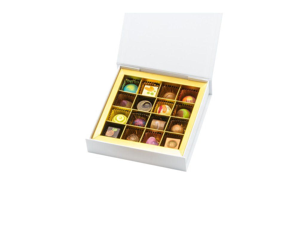 Dopřejte si dokonalý chuťový zážitek s kolekcí šestnácti ručně vyráběných čokoládových pralinek, zabalených v bílé krabičce.