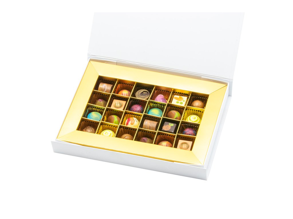 Dopřejte si dokonalý chuťový zážitek s kolekcí čtyřiadvaceti ručně vyráběných čokoládových pralinek, zabalených v bílé krabičce.