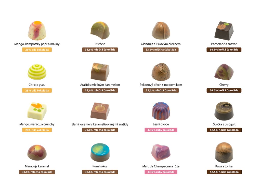 Mango, kampotský pepř a maliny - Bílá čokoláda 28% (cukr, kakaové máslo, sušené plnotučné mléko, emulgátor E322 (sojový lecitin), přírodní vanilkové aroma), mangové pyré, smetana 33%, kampotský pepř černý, sušené maliny, konfitura z manga a maracuji, barevné kakaové máslo. Obsah alergenů: 6 (sója), 7 (mléko) Citrico yuzu - Bílá čokoláda 28% (cukr, kakaové máslo, sušené plnotučné mléko, emulgátor E322 (sojový lecitin), přírodní vanilkové aroma), limetová šťáva, yuzu pasta, smetana 33%, barevné kakaové máslo. Obsah alergenů: 6 (sója), 7 (mléko) Mango, maracuja crunchy - Mléčná čokoláda 33,6% (cukr, kakaové máslo, sušené plnotučné mléko, kakaová hmota, emulgátor E322 (sojový lecitin), přírodní vanilkové aroma), Bílá čokoláda 28% (cukr, kakaové máslo, sušené plnotučné mléko, emulgátor E322 (sojový lecitin), přírodní vanilkové aroma), pyré ze sušené maracuji a manga, kousky sušenek, barevné kakaové máslo. Obsah alergenů: 1 (pšenice), 6 (sója), 7 (mléko) Maracuja karamel - Mléčná čokoláda 33,6% (cukr, kakaové máslo, sušené plnotučné mléko, kakaová hmota, emulgátor E322 (sojový lecitin), přírodní vanilkové aroma), maracujové pyré, glukózový sirup, cukr, smetana 33%, sušená maracuja v kakaovém másle, barevné kakaové máslo. Obsah alergenů: 6 (sója), 7 (mléko) Pistácie - Mléčná čokoláda 33,6% (cukr, kakaové máslo, sušené plnotučné mléko, kakaová hmota, emulgátor E322 (sojový lecitin), přírodní vanilkové aroma), Bílá čokoláda 28% (cukr, kakaové máslo, sušené plnotučné mléko, emulgátor E322 (sojový lecitin), přírodní vanilkové aroma), pistáciová pasta, barevné kakaové máslo. Obsah alergenů: 6 (sója), 7 (mléko), 8 (pistácie) Arašid s mléčným karamelem - Mléčná čokoláda 33,6% (cukr, kakaové máslo, sušené plnotučné mléko, kakaová hmota, emulgátor E322 (sojový lecitin), přírodní vanilkové aroma), Karamelová čokoláda 30,4% (kakaové máslo, cukr, sušené plnotučné mléko, mléčný cukr, syrovátkový prášek (mléko), sušené odtučněné mléko, karamelizovaný cukr 2%, emulgátor E322 (sojový lecithin), přírodní vanilkové aroma), arašídová pasta, cukr, glukózový sirup, vanilka, máslo, barevné kakaové máslo. Obsah alergenů: 5 (arašídy), 6 (sója), 7 (mléko) Slaný karamel s karamelizovanými arašídy - Mléčná čokoláda 33,6% (cukr, kakaové máslo, sušené plnotučné mléko, kakaová hmota, emulgátor E322 (sojový lecitin), přírodní vanilkové aroma), Karamelová čokoláda 30,4% (kakaové máslo, cukr, sušené plnotučné mléko, mléčný cukr, syrovátkový prášek (mléko), sušené odtučněné mléko, karamelizovaný cukr 2%, emulgátor E322 (sojový lecithin), přírodní vanilkové aroma), smetana 33%, glukózový sirup, cukr, fleur de sel, vanilka, sůl, arašídový krokant, barevné kakaové máslo. Obsah alergenů: 5 (arašídy), 6 (sója), 7 (mléko) Rum kokos - Mléčná čokoláda 33,6% (cukr, kakaové máslo, sušené plnotučné mléko, kakaová hmota, emulgátor E322 (sojový lecitin), přírodní vanilkové aroma), Bílá čokoláda 28% (cukr, kakaové máslo, sušené plnotučné mléko, emulgátor E322 (sojový lecitin), přírodní vanilkové aroma), pečené kousky kokosu, kokosová ochucovací pasta, tmavý rum, smetana 33%, barevné kakaové máslo. Obsah alergenů: 6 (sója), 7 (mléko) Gianduja s lískovým ořechem - Mléčná čokoláda 33,6% (cukr, kakaové máslo, sušené plnotučné mléko, kakaová hmota, emulgátor E322 (sojový lecitin), přírodní vanilkové aroma), pasta z lískových ořechů, krokant z lískových ořechů, barevné kakaové máslo. Obsah alergenů: 6 (sója), 7 (mléko), 8 (lískové ořechy) Pekanový ořech s medovníkem - Mléčná čokoláda 33,6% (cukr, kakaové máslo, sušené plnotučné mléko, kakaová hmota, emulgátor E322 (sojový lecitin), přírodní vanilkové aroma), Karamelová čokoláda 30,4% (kakaové máslo, cukr, sušené plnotučné mléko, mléčný cukr, syrovátkový prášek (mléko), sušené odtučněné mléko, karamelizovaný cukr 2%, emulgátor E322 (sojový lecithin), přírodní vanilkové aroma), pekanová pasta, perníkové koření, barevné kakaové máslo. Obsah alergenů: 6 (sója), 7 (mléko), 8 (pekanové ořechy) Lesní ovoce - Ruby čokoláda 33,6% (cukr, kakaové máslo, sušené odtučněné mléko, plnotučné sušené mléko, kakaová hmota, emulgátor E322 (sojový lecitin), kyselina citrónová, přírodní vanilkové aroma), Bílá čokoláda 28% (cukr, kakaové máslo, sušené plnotučné mléko, emulgátor E322 (sojový lecitin), přírodní vanilkové aroma), pyré z lesního ovoce, smetana 33%, malinová ochucovací pasta, sušené brusinky, barevné kakaové máslo. Obsah alergenů: 6 (sója), 7 (mléko) Marc de Champagne a růže - Ruby čokoláda 33,6% (cukr, kakaové máslo, sušené odtučněné mléko, plnotučné sušené mléko, kakaová hmota, emulgátor E322 (sojový lecitin), kyselina citrónová, přírodní vanilkové aroma), Bílá čokoláda 28% (cukr, kakaové máslo, sušené plnotučné mléko, emulgátor E322 (sojový lecitin), přírodní vanilkové aroma), likér Marc de Champagne 8,5 %, cukr, syrovátkový koncentrát (mléko), mléčný protein, konfitura z ruží, barevné kakaové máslo. Obsah alergenů: 6 (sója), 7 (mléko) Pomeranč a zázvor - Hořká čokoláda 54,5% (kakaová hmota, cukr, kakaové máslo, emulgátor E322 (sojový lecithin), přírodní vanilkové aroma), pomerančový olej, smetana 33%, sušený mletý zázvor, kandovaná pomerančová kúra, barevné kakaové máslo. Obsah alergenů: 6 (sója), 7 (mléko) Cherry - Hořká čokoláda 54,5% (kakaová hmota, cukr, kakaové máslo, emulgátor E322 (sojový lecithin), přírodní vanilkové aroma), višňové pyré, rum, smetana 33%, višňový gel z 