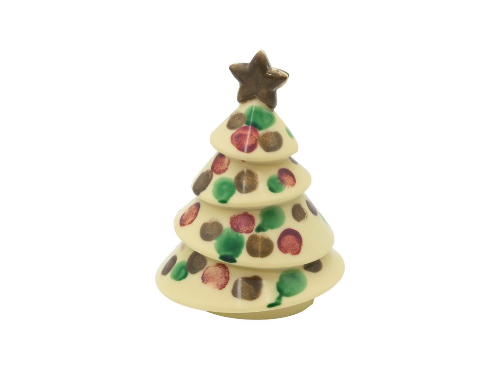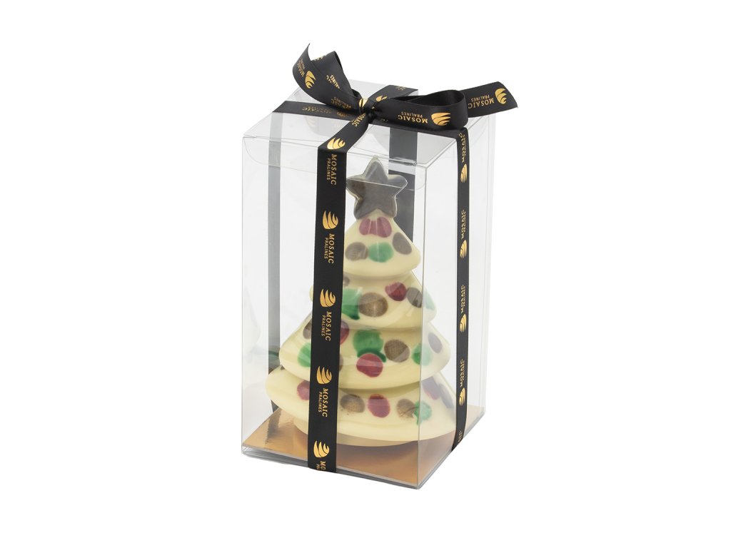 Uvnitř se skrývá překvapení – tři mléčné čokoládovové figurky, které dodávájí tomuto sladkému dárku hravý nádech. Každý stromeček je vyráběn s důrazem na detail a poctivou chuť pravé čokolády.