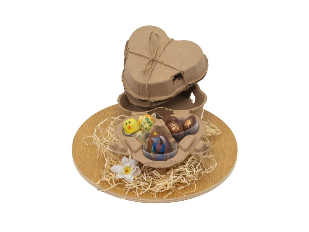 Toto velikonoční plato se třemi vejci je ideální sladká kolekce pro jarní svátky. Každé vejce je tvořeno průhlednou plastovou skořápkou, ve které se ukrývá výběr čokoládových pralinek a drobných čokoládových figurek.